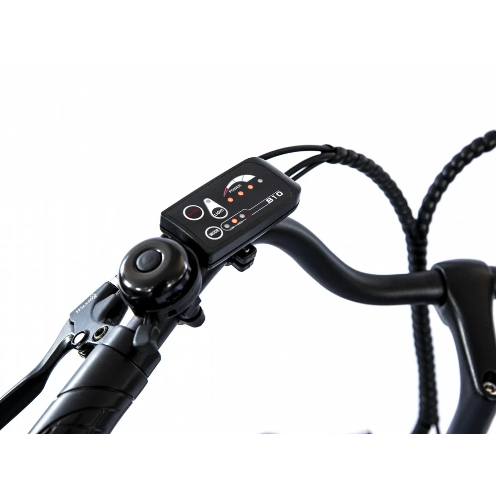 Складная конструкция рамы изготовлена из инновационного сплава алюминия, выдерживающего максимальные нагрузки. На подседельном штыре установлена батарея емкостью 8 А*ч. Штырь регулируется по высоте, рулевая часть электровелосипеда – по высоте и углу наклона. Переключение скоростей (7) проводится с помощью половинчатой ручки, размещенной на рулевой части.