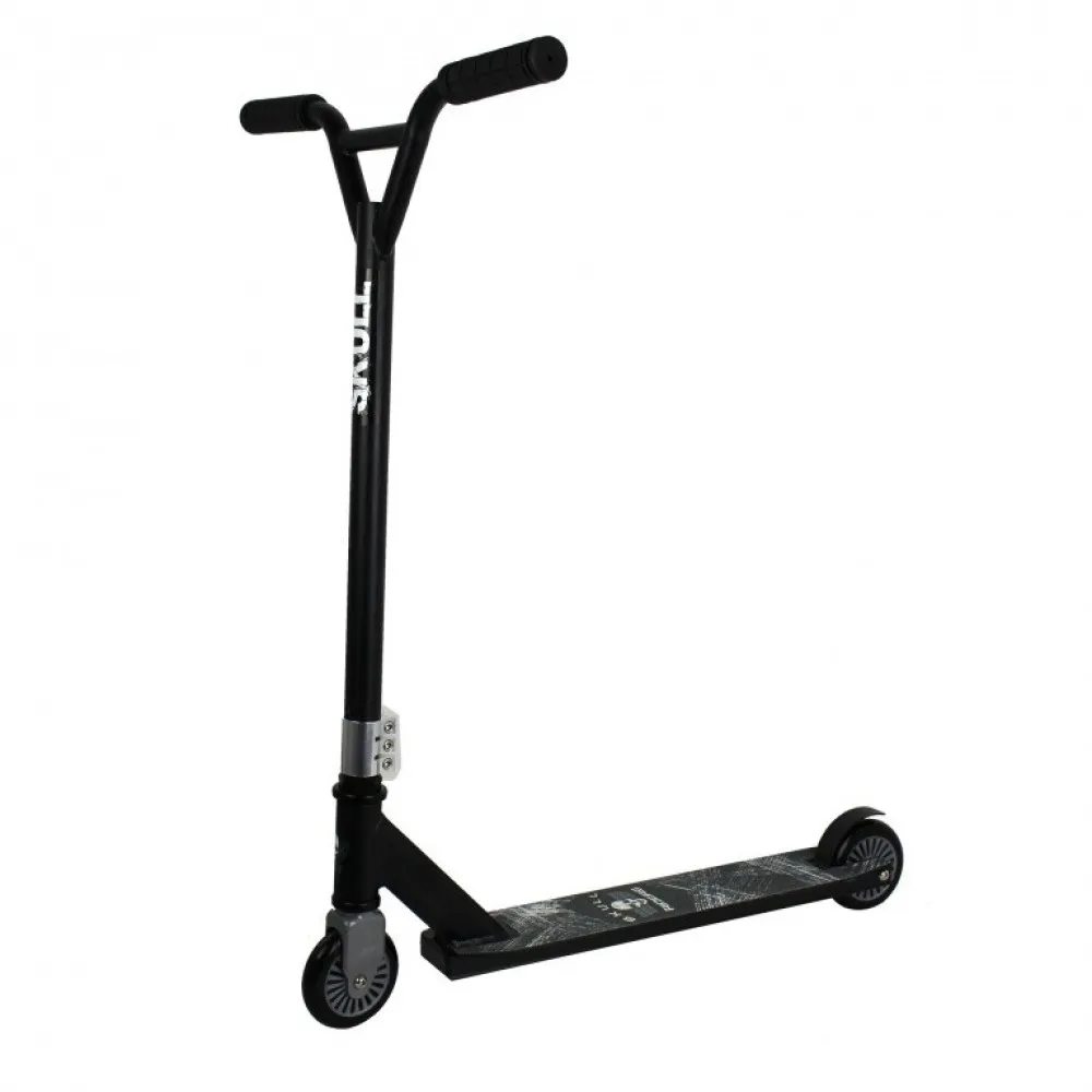 Корпус самоката изготовлен из высококачественного алюминиевого сплава, а передняя вилка – из высокопрочной стали. Такое гармоничное сочетание обеспечивает высокую износостойкость, прочность и одновременную легкость. Все эти характеристики являются необходимыми составляющими любого трюкового самоката.