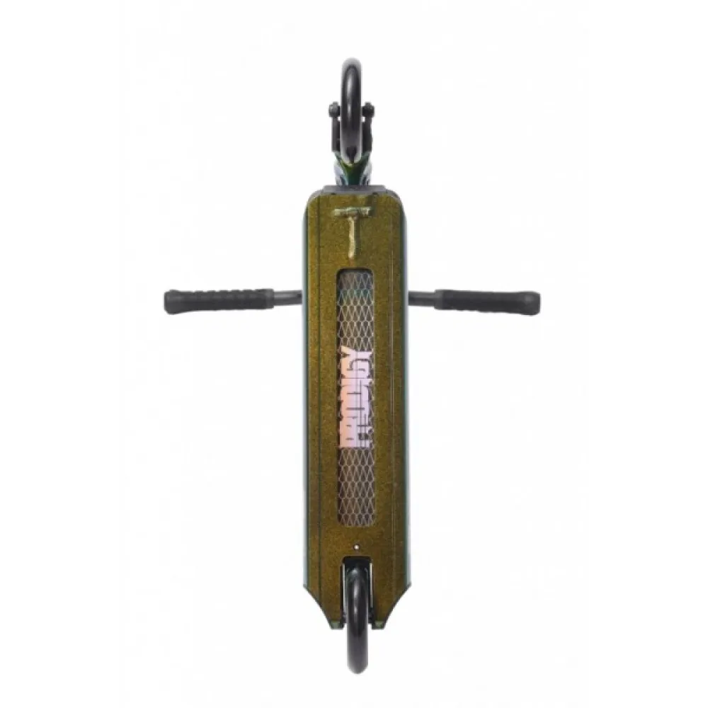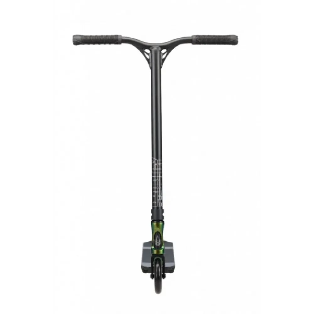 Y-образная форма руля имеет достаточную высоту, удобную для маневрирования и экстремального вождения. Форма руля сравнительно высокая, рассчитана на райдеров с разными ростовыми параметрами. Широкая дека размерами покрыта среднезернистой брендовой шкуркой. Анатомические удлиненные грипсы не провоцируют скольжения и запотевания рук, обеспечивают надежный хват. При массе 3,5 кг максимальная грузоподъемность модели составляет 100 кг.