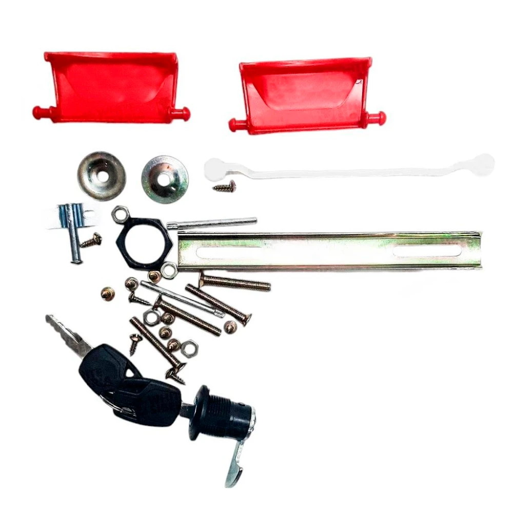 1 комплект креплений и запчастей (2 красных крепежа для закрытия крышки бокса, замок с личинкой и ключом, крепление для замка, резиновая прокладка под замочный механизм, 2 шпильки для соединения крышки и дна бокса, жгутик откидной для крышки бокса, болты, гайки и 2 планки для крепления бокса к металлическому каркасу